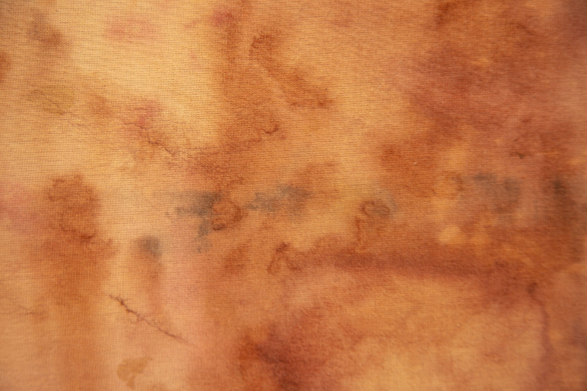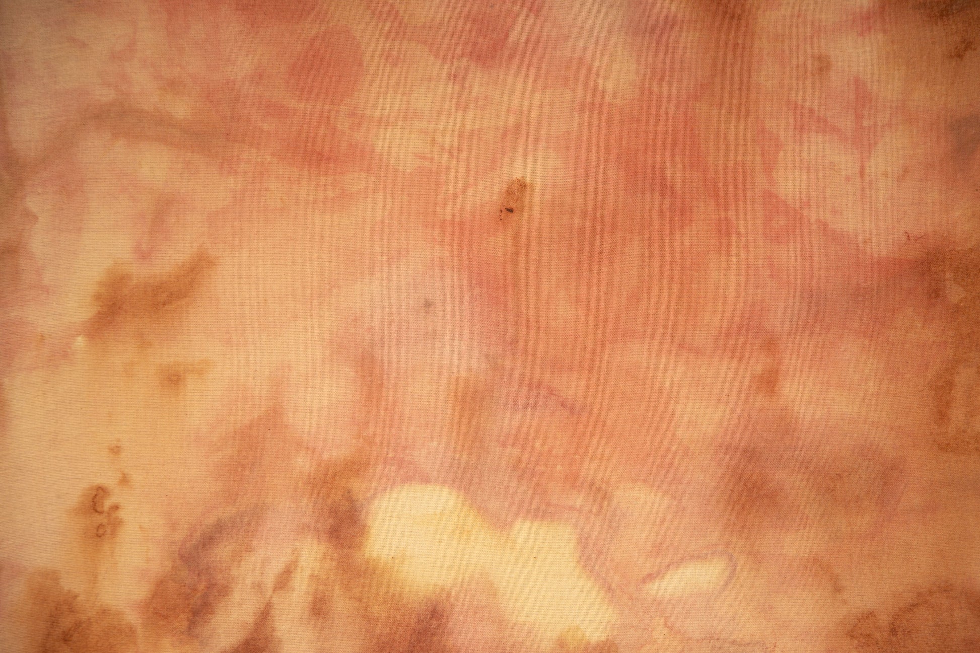 Biopintura textil en lienzo de algodón, teñido con flores, estampación de rosa amarilla, cascaras de aguacate. Raíces de rubia tinctorum y modificaciones de PH.