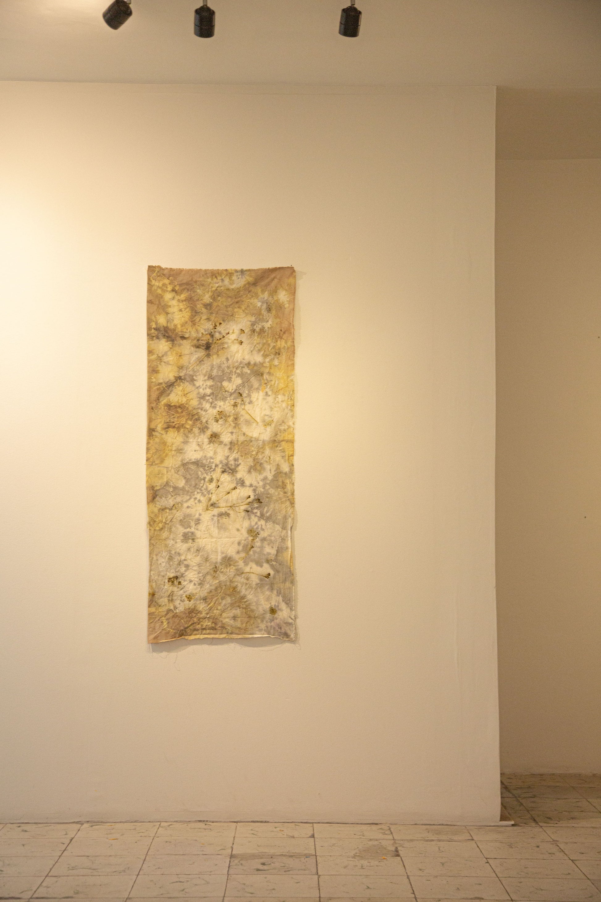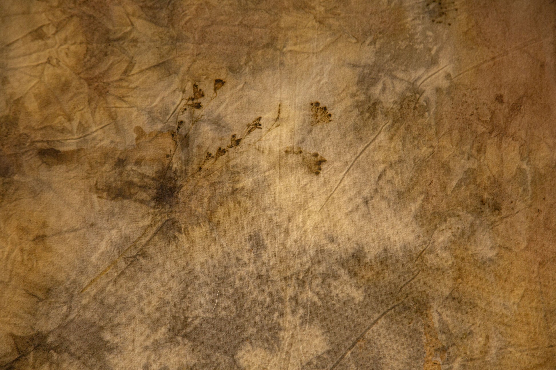 Estampación botánica de flores de huacatay, tinturado con hojas de eucalipto y modificaciones de PH con hierro.